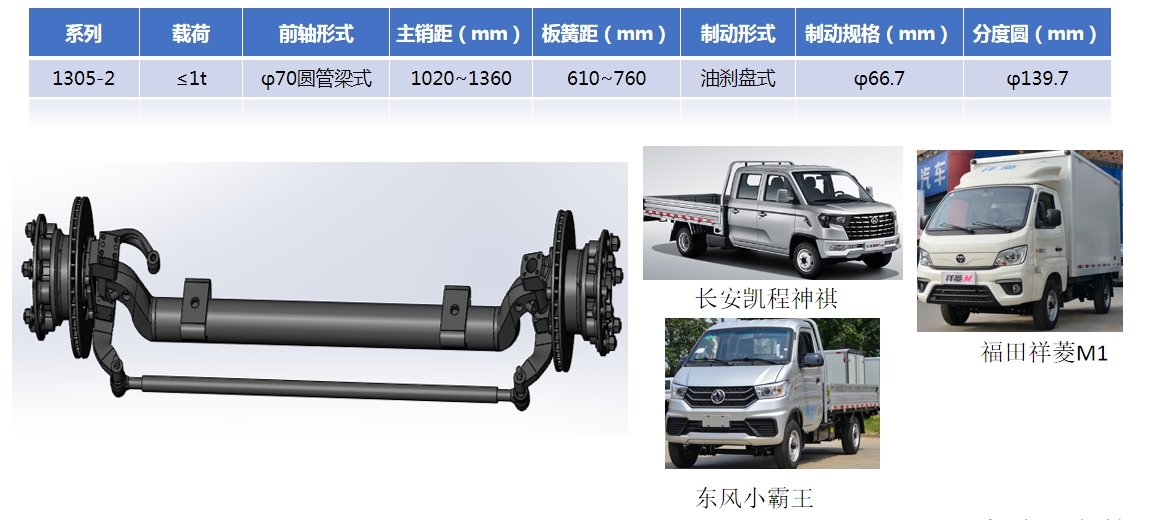 ◆轻卡前桥总成前轴采用管式结构,优质前轴管焊合件,在保证满足承载要求的同时,端面距、板簧距的调整更加灵活,满足不同路况的定制化需求。